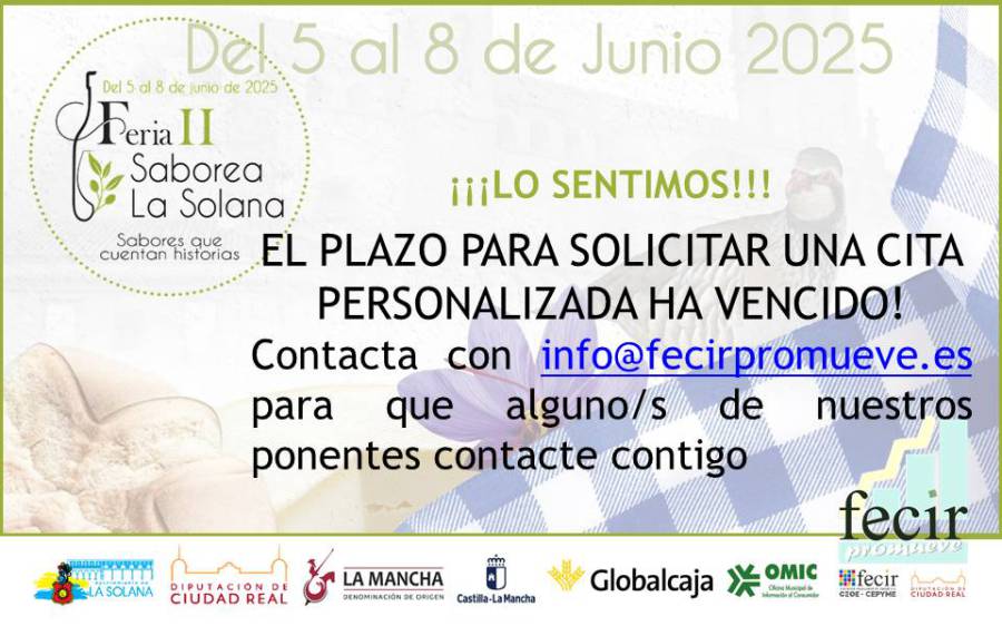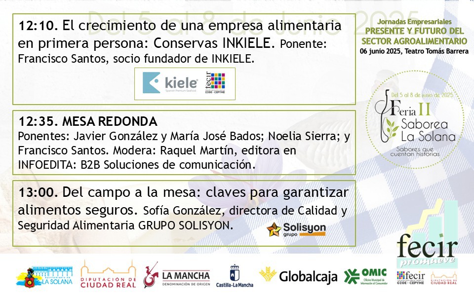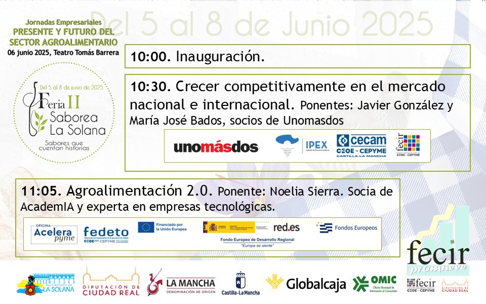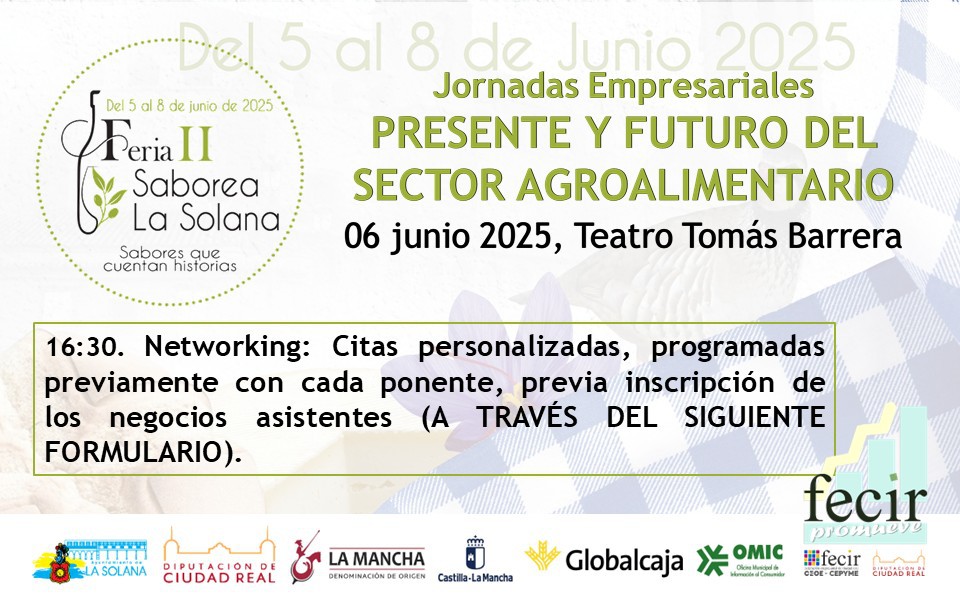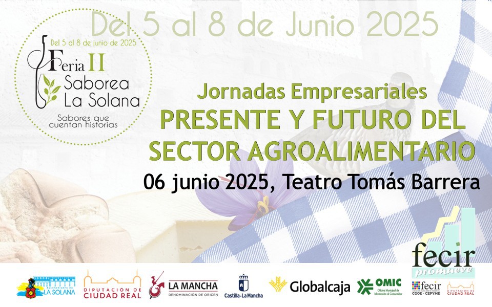 FECIR PROMUEVE participa en SABOREA LA SOLANA colaborando en la organización de una Jornada PRESENTE Y FUTURO DEL SECTOR AGROALIMENTARIO, destinada a empresas de alimentación de la Solana y alrededores y en la que se abordarán diferentes aspectos de interés para PYME´s. Dicha jornada se celebra la mañana del 6 de junio.
